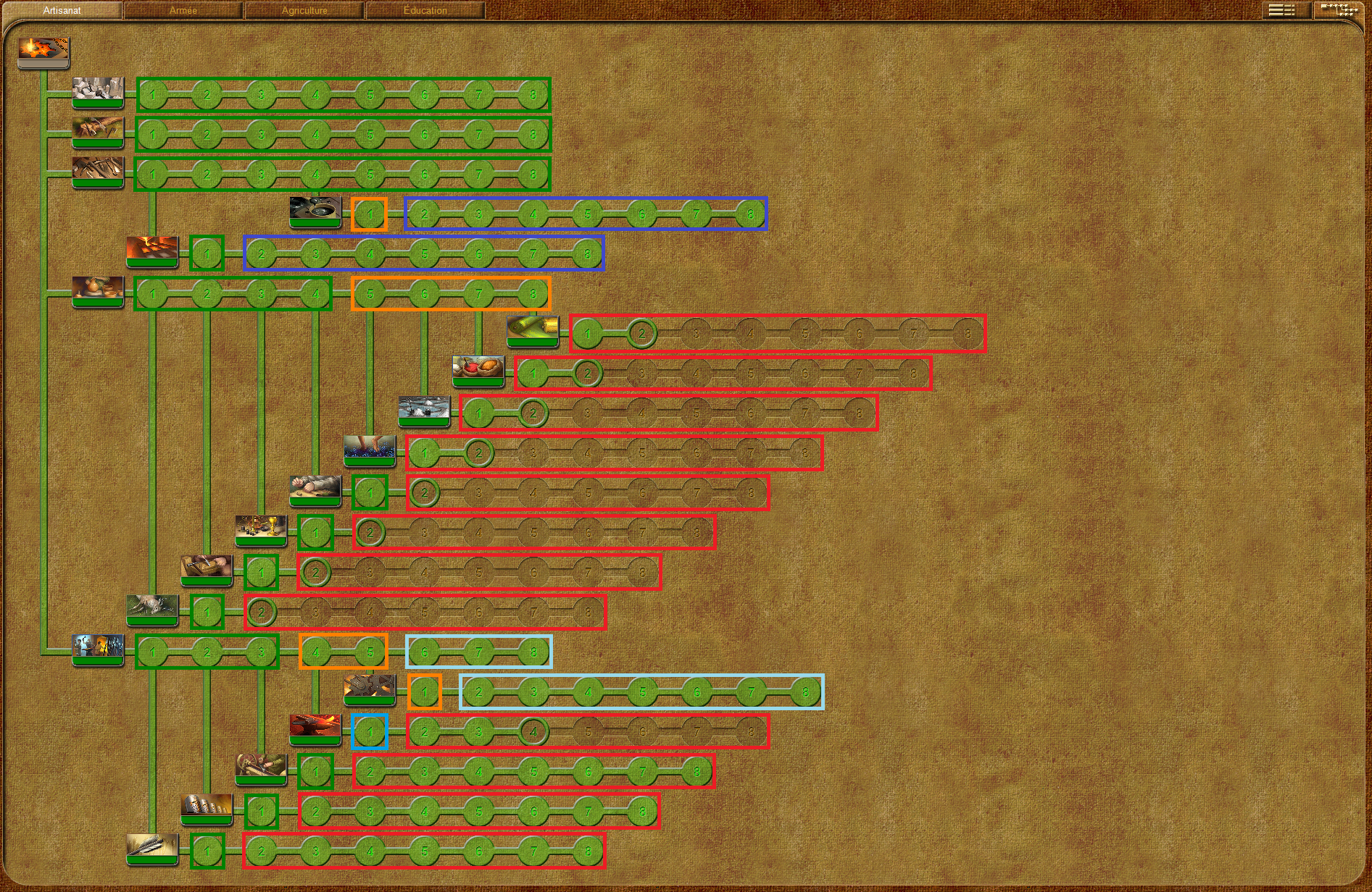 Un point important concernant l'achat de point: Vous pouvez acheter quelques points au début, il ne coût pas très cher, mais rapidement, le prix va monter. Après une dizaine de points acheté, je vous conseil de monter la philosophie avant d'en acheter d'autres. Normalement, l'achat de point va se faire majoritairement quand vous allez être dans les tons de bleus. J'ai calculé le tout pour que les couleurs verte et orange arrive avec le bon nombre de recherche quand vous êtes rendu au début du rang Marquis.